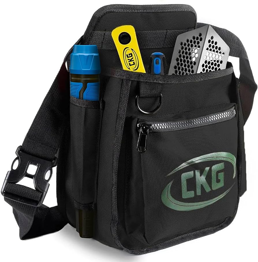 Upgrade your treasure-hunting gear with the CKG Finds and Tool Bag, a reliable and durable accessory designed for metal detecting enthusiasts. Crafted from high-quality 600D polyester fabric, this bag is thicker and sturdier than most others on the market, ensuring it stands up to the demands of any detecting adventure. With its robust construction, it offers long-lasting performance and excellent protection for your tools and finds.