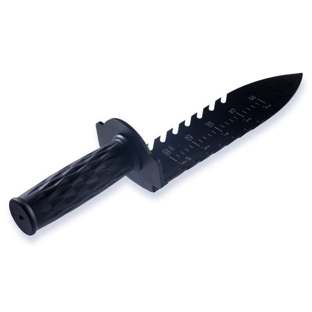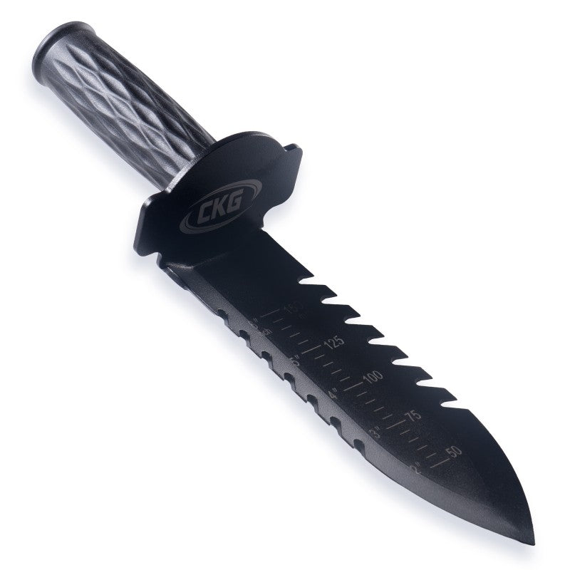 A quality digging trowel from CKG, supplied with its own sheath. The coated steel blade has a sharp tip and serrated edges to get through tough soil and roots. The rubberised handle gives the best in comfort and grip. Its blade has a depth gauge to monitor how deep your target is. The sheath has a velcro fastening belt loop for quick and easy fitting and removal.